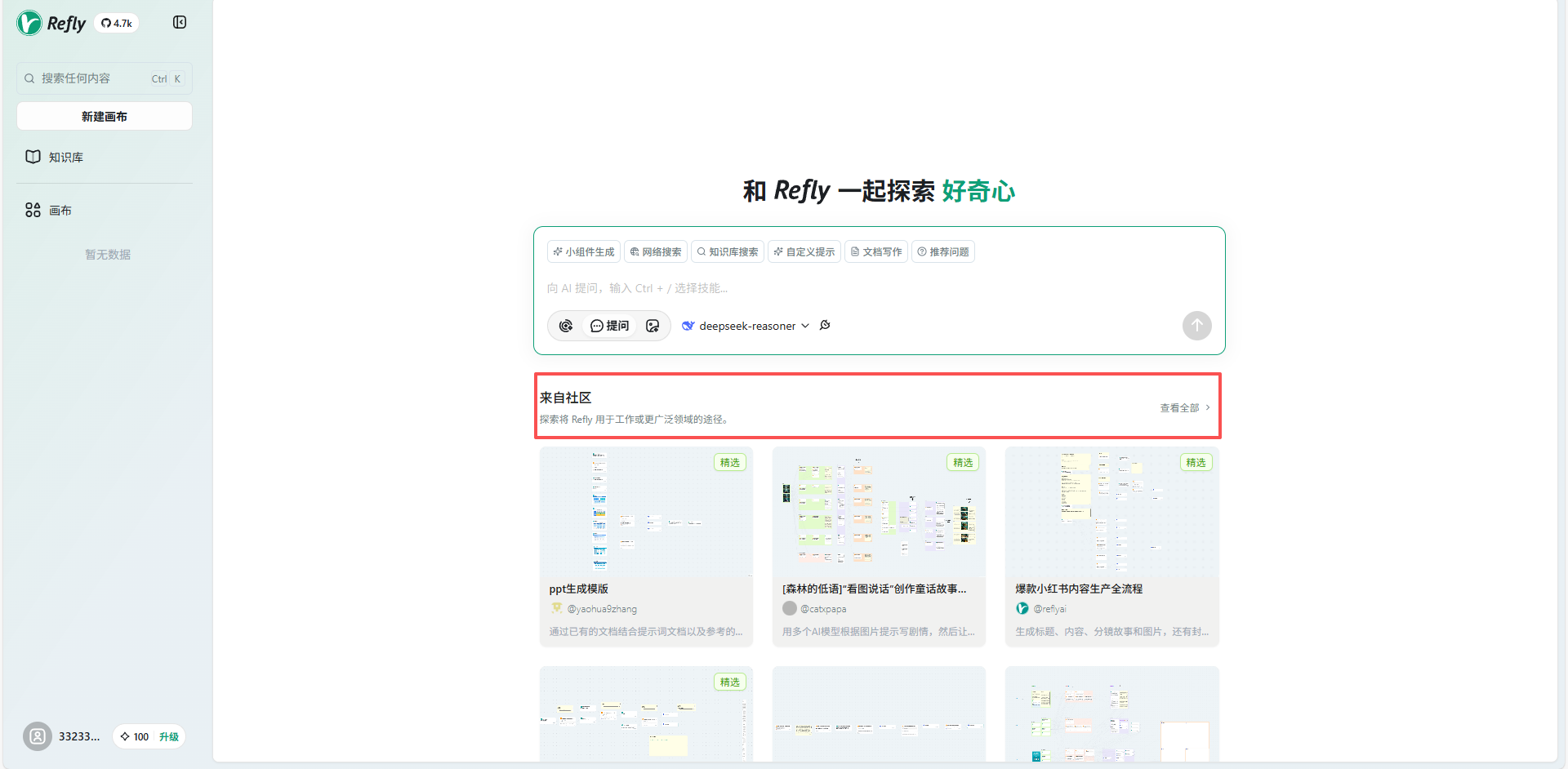 打开 Refly 官网 进入主页面,社区板块选择响应工作流模板。
