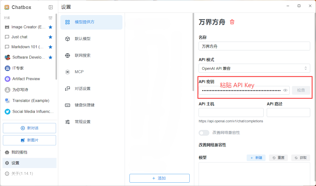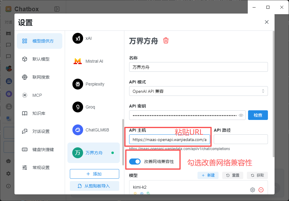 在 Chatbox 中配置万界方舟模型