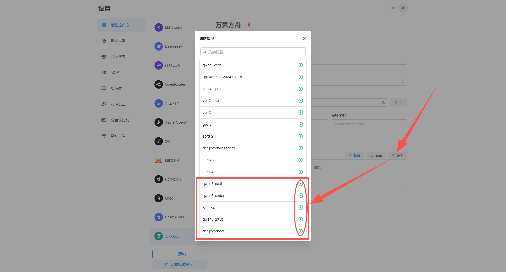 如果没有显示弹窗,需要点击设置--模型提供方--添加--在名称中输入“万界方舟”。