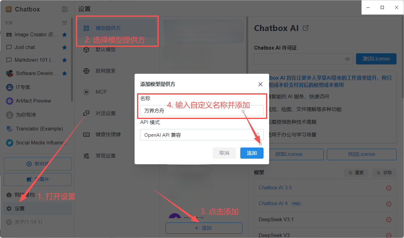 - 打开 Chatbox 客户端,在弹窗中选择使用自己的 API KEY 或本地模型--添加--在名称中输入“万界方舟”。