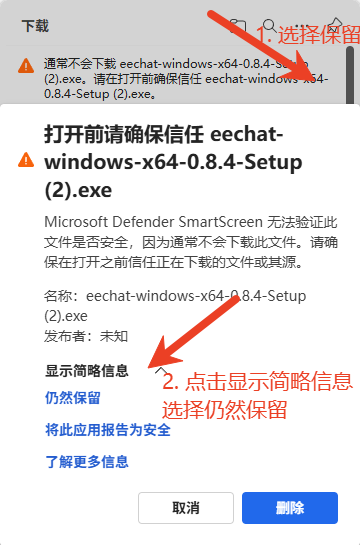 注意:下载 eechat 时,系统浏览器可能会提示无法下载,这可能是因为安全软件判定为恶意软件导致的,我们选择保留下载安装包即可(如果未出现请忽略)。
