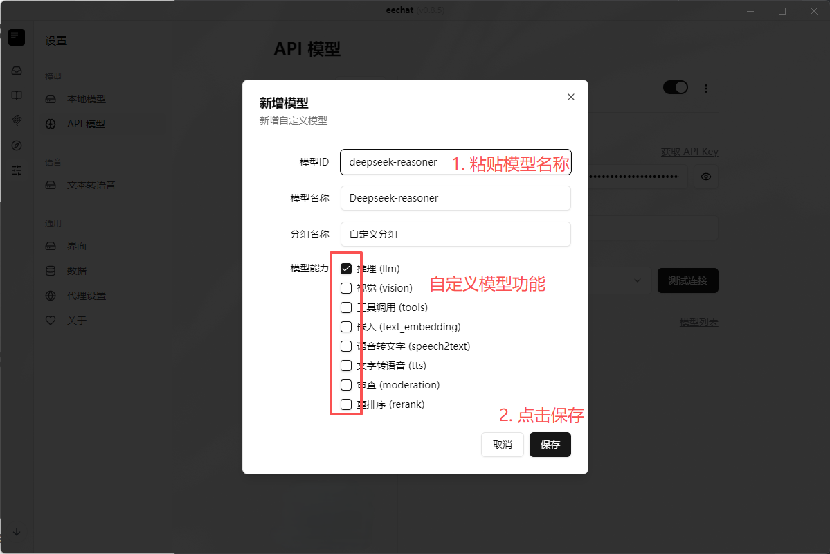 - 回到 eechat ,点击左侧 设置--API 模型--选择万界方舟--新增模型,将复制的模型名称粘贴到模型 ID 中,模型能力可根据自身需求进行选择并点击保存。