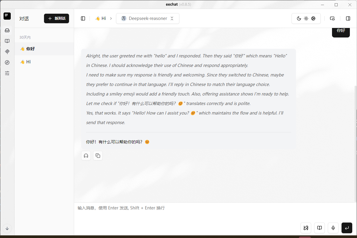eechat 是国产开源免费跨平台AI应用,兼容 Windows/macOS/Linux 系统,整合智能对话、多模态指令交互(MCP)、知识库检索增强(RAG)、语音识别(ASR)与合成(TTS)等核心功能模块,构建全栈式 AI 解决方案。其模块化设计支持企业快速部署智能服务,满足多场景人机交互需求。