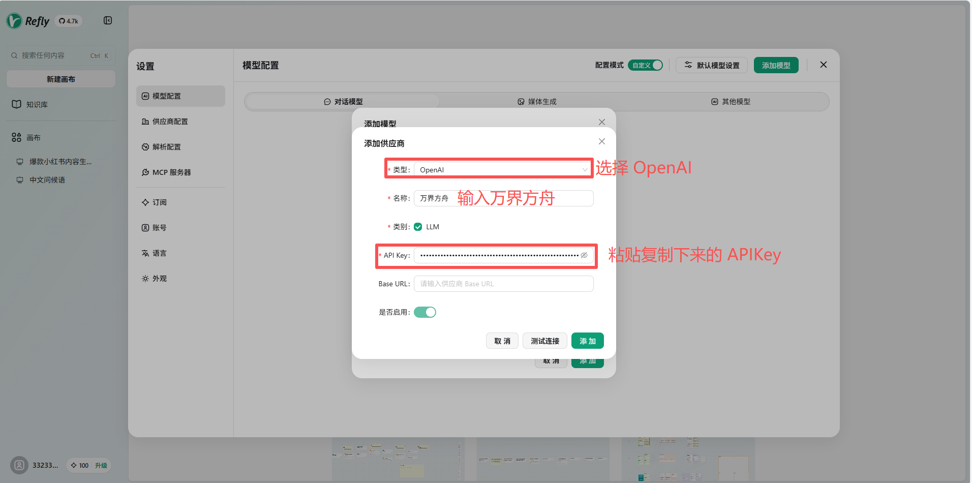 Refly 供应商类型选择 OpenAI 名称输入“万界方舟”,将复制下来的 APIKey 进行粘贴。