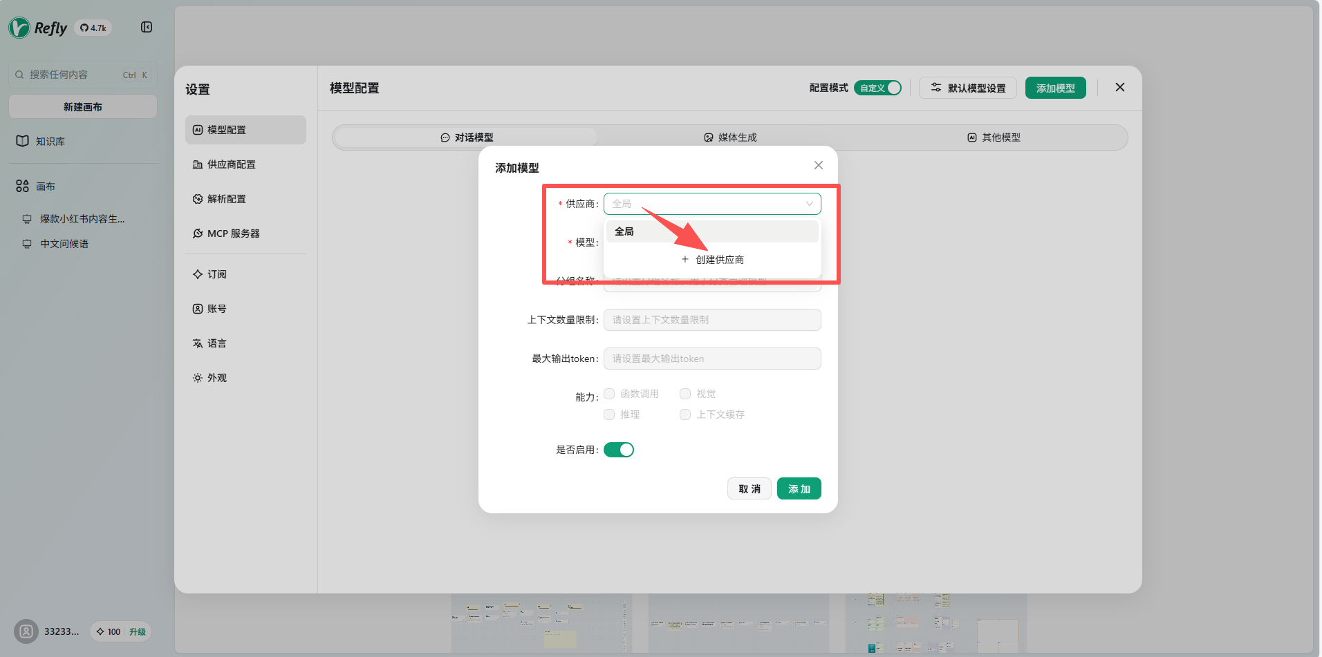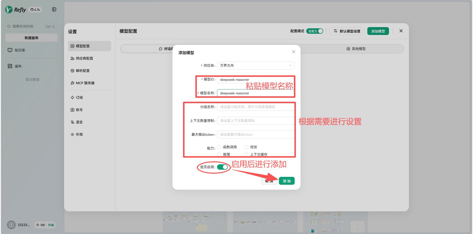 在 Refly 的模型 ID 、模型名称中进行模型粘贴后启用模型并添加。