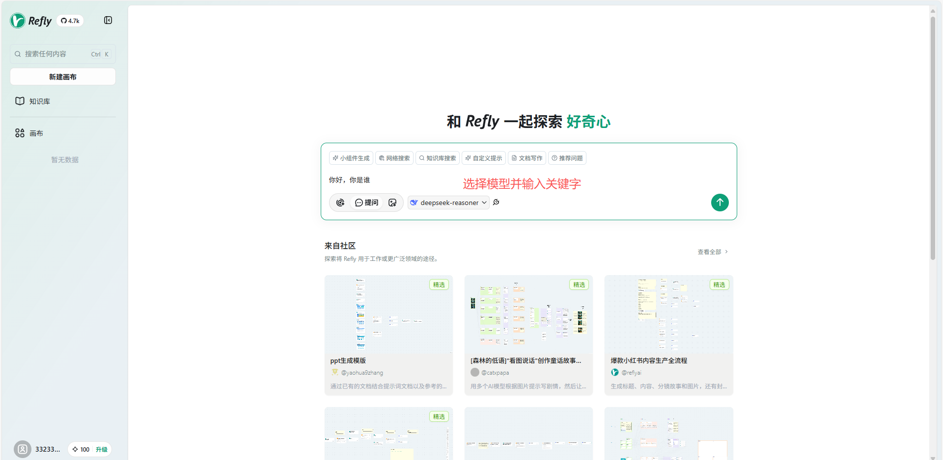 完成以上配置后,返回到 Refly 主界面,选择模型后输入关键字。
