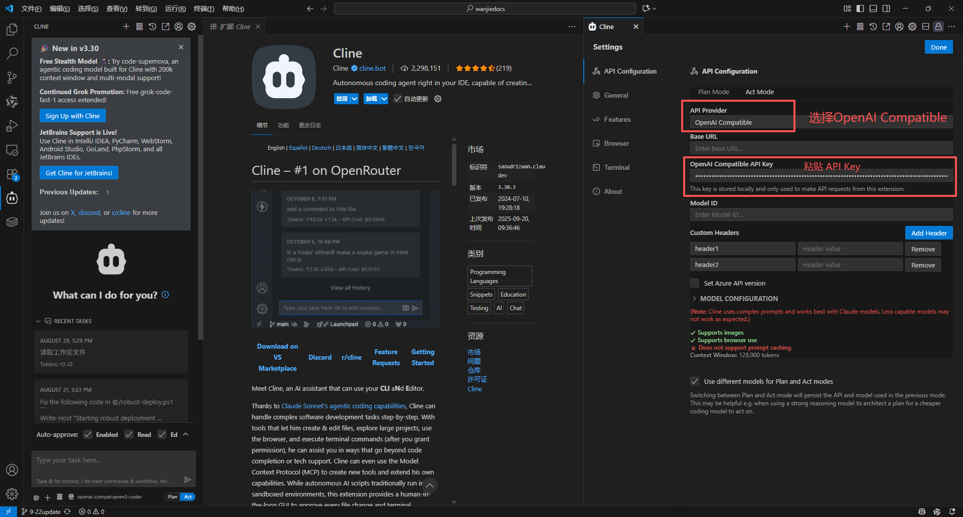 回到 VScode,在“ API Provider ”中选择“ OpenAI Compatible ”,将复制的 APIKEY 粘贴到 API Key 输入框中。