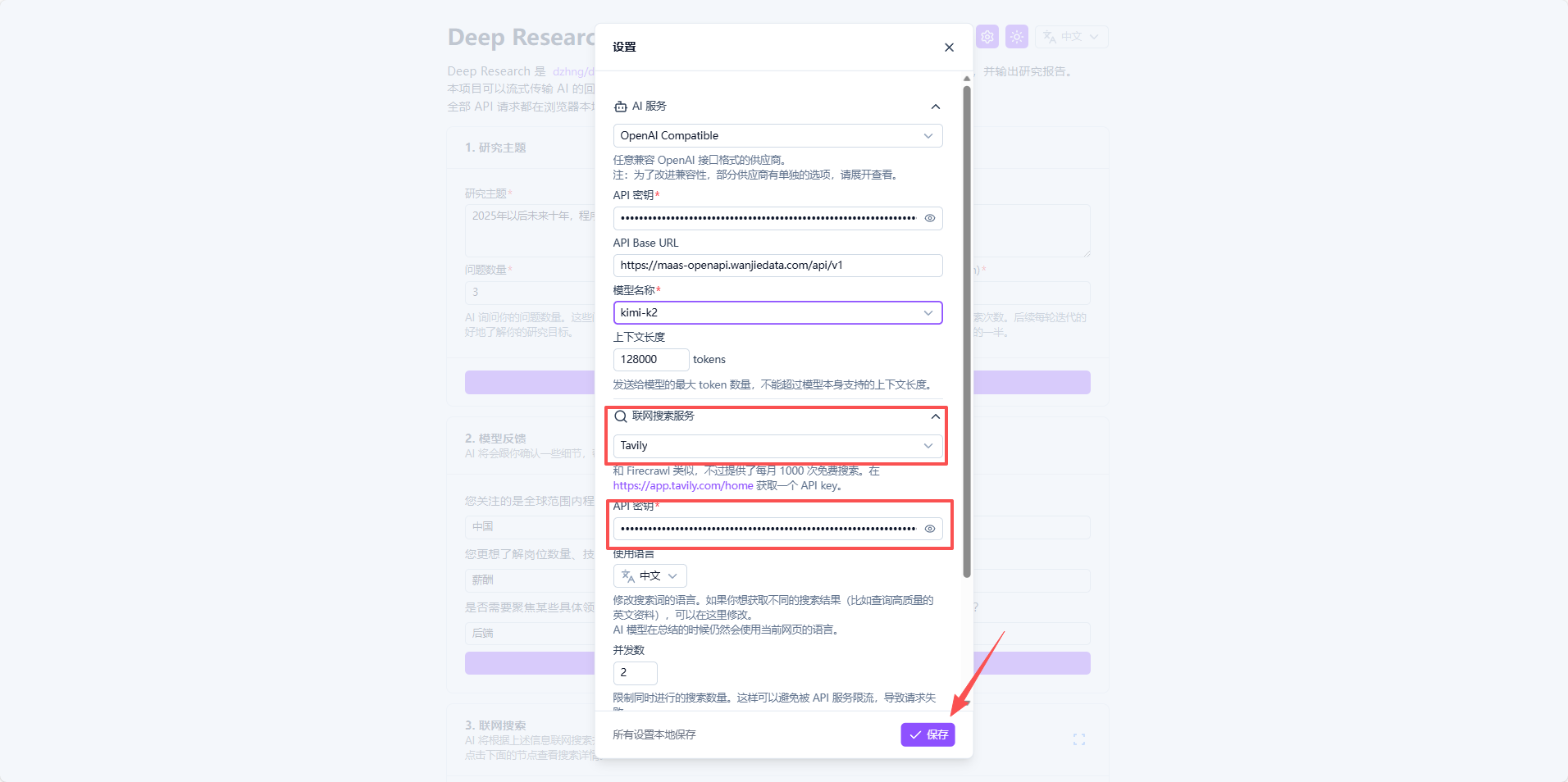 - 联网搜索服务选择 Tavily ,并将 API Key 再次粘贴到 API 密钥中。